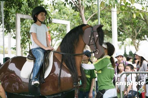 四月六日,香港大埔海濱公園舉行大埔迎奧運嘉年華,向市民宣揚奧運精神,并加深對香港協辦的奧運馬術項目的認識與熱愛,中國香港體育協會暨奧林匹克委員會會長霍震霆、香港民政事務局局長曾德成等出席活動。圖為小朋友通過試騎電動馬體驗馬術。 中新社發 武仲林 攝