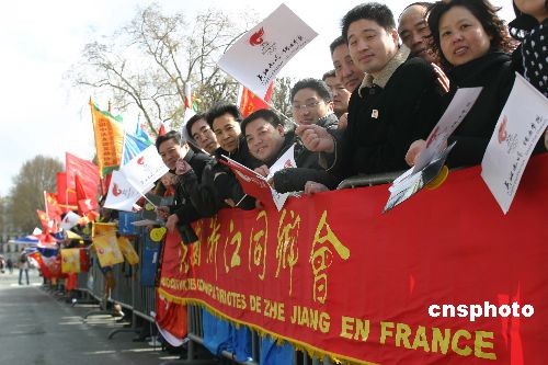 法國當?shù)貢r間4月7日中午,北京奧運圣火在“浪漫之都”巴黎傳遞在巴黎的地標埃菲爾鐵塔拉開帷幕。圖為法國巴黎當?shù)厝A人華僑在埃菲爾鐵塔下迎接奧運圣火。 沈晨 攝