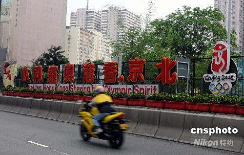為迎接2008北京奧運(yùn),香港港九新界大街小巷精心布置,隨處可見(jiàn)迎接奧運(yùn)的標(biāo)志和旗幟。圖為五月一日,一位市民駕駛電單車經(jīng)過(guò)香港新界街道。中新社發(fā) 蔡蔓莉 攝