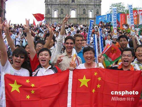五月三日下午,數千名澳門市民和游客在澳門的標志性建筑——大三巴牌坊前迎接奧運圣火,為北京奧運加油。中新社發 畢永光 攝