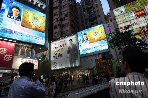 五月十二日晚,香港市民在街頭觀看新聞,關注四川等地發生的地震消息。當天下午,香港天文臺也接獲市民報告,多名市民表示感覺到一次震動。中新社發 洪少葵 攝