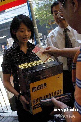 五月十四日,香港民建聯繼續在中環鬧市為四川大地震災民籌款,眾多市民及游客慷慨解囊。中新社發 譚達明 攝