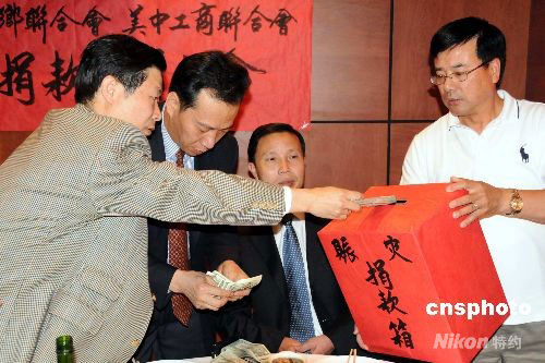當地時間十四日晚,四十一位閩籍華僑在華盛頓中國城發起四川大地震賑災募捐,十分鐘現場捐款就達二萬一千多美元。圖為美國福建同鄉聯合會僑胞積極為四川災區捐款,表達愛心。中新社發 邱江波 攝