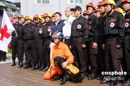 五月十六日上午,臺北市長郝龍斌在臺北市災害應變中心向救援隊授旗,加油打氣。由臺灣紅十字會組織派遣的救援隊一行二十二人和一只搜救犬五月十六日下午將乘包機直飛四川救災。臺灣紅十字會組織派遣的這支救援隊隸屬于臺北市。中新社發(fā) 陳立宇 攝