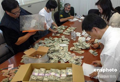 當地時間五月十七日,四川大地震發生后的第一個周末,在洛杉磯地區工作生活的普通華人華僑頂著華氏一百度的高溫走上街頭,為遠隔萬里的災區同胞默默捐出一張張現金和支票。短短六個小時的街頭募捐活動共籌得四十萬美元。圖為羅省中華總商會會長莊佩源(左一)等人正在清點部分捐款。中新社發 張煒 攝