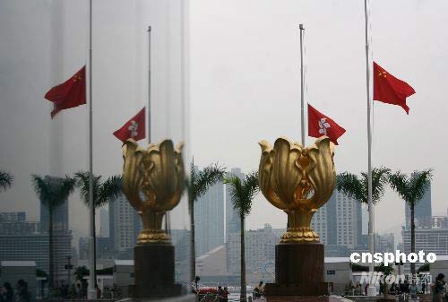 五月十九日是全國(guó)哀悼日,香港金紫荊廣場(chǎng)下半旗,對(duì)四川大地震遇難者表示深切哀悼。中新社發(fā) 武仲林 攝