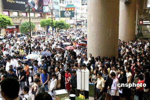 五月十九日下午二點(diǎn)二十八分,香港時代廣場眾多市民停住匆忙的腳步,為四川汶川大地震遇難同胞默哀三分鐘。中新社發(fā) 王麗南 攝