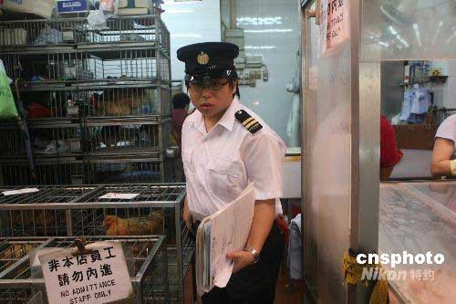 六月七日,香港一名工作人員對銅鑼灣街市一家活雞攤檔進行巡查。香港食物及衛(wèi)生局局長周一岳當(dāng)日表示,確定月初在保安道街市抽取的五個雞只樣本,帶有H5N1禽流感病毒,特區(qū)政府對禽流感的應(yīng)變級別將由原來的“戒備”級別,升為“嚴(yán)重”級別。中新社發(fā) 武仲林 攝