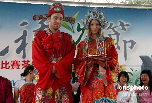 六月七日,正在臺灣師范大學進修漢語技能的十六名老外,應邀體驗一年一度的臺灣“文山包種茶節”。由一對男女學生臨時湊成的“夫妻檔”,現場體驗傳統中式“茶婚禮”,“新娘”為扮演男方家長的其他幾位外籍學生奉茶,完成“文定”儀式。中新社發 許曉青 攝