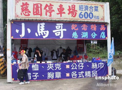 臺灣旅游業界為迎接大陸居民赴臺旅游,已開始做各項準備工作。圖為臺灣桃園縣經營旅游商品的商販,在慈湖蔣介石陵寢的路邊,設立了招攬大陸游客的、專售與馬英九相關的旅游紀念品的商棚。中新社發 耿軍 攝