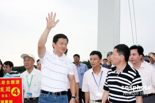 7月5日,大陸居民赴臺旅游首發(fā)團抵臺第二天。臺北縣長周錫瑋專程來到臺北縣古鎮(zhèn)淡水,對大陸游客表達歡迎,并親自為來自福建的旅游團導覽淡水風光漁人碼頭、情人橋等。中新社發(fā) 黃少華 攝