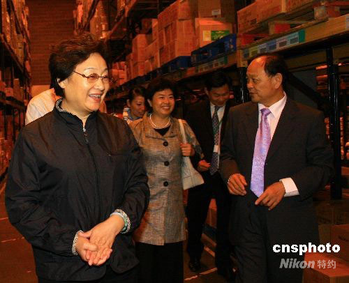 當(dāng)?shù)貢r間11日下午,抵英訪問的中國國務(wù)院僑辦主任李海峰前往當(dāng)?shù)厝A商企業(yè)“泗和行”,現(xiàn)場了解其經(jīng)營與發(fā)展?fàn)顩r。圖為李海峰(左)在泗和行老板謝貴全(右)的陪同下,參觀其現(xiàn)代化倉儲基地。中新社發(fā) 李鵬 攝