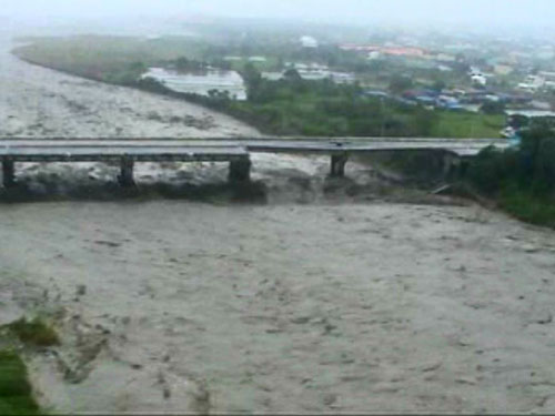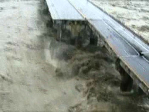 因森拉克臺風豪雨影響,臺灣臺中縣后豐大橋日前發(fā)生斷裂垮塌,造成三車六人墜落橋下遭滾滾洪水沖走慘劇。圖為空中勤務(wù)總隊直升機空拍斷橋全景的鏡頭。“中央社”圖