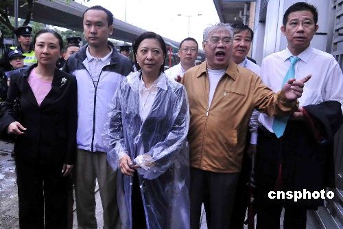 十一月三日,香港民建聯(lián)副主席蔣麗蕓(右三)及立法會(huì)議員黃定光(右二),與幾十名中小企的代表早上由遮打花園游行至政府總部,他們不滿銀行縮減信貸額,令營(yíng)運(yùn)資金緊絀,難以周轉(zhuǎn)。中新社發(fā) 譚達(dá)明 攝