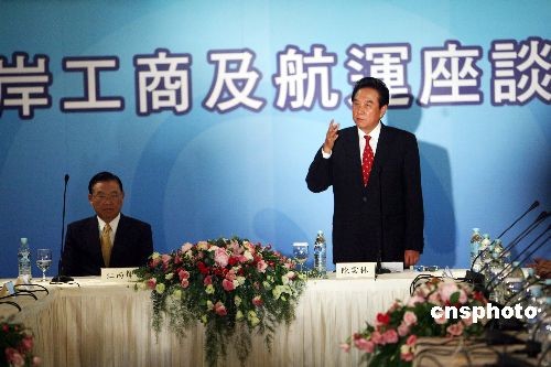 十一月五日上午,兩岸工商及航運座談會在臺北圓山飯店舉行。海協(xié)會會長陳云林、海基會董事長江丙坤一同出席座談會。中新社發(fā) 洪少葵 攝