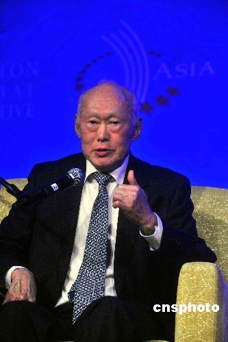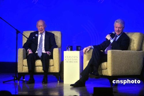 圖為克林頓與新加坡資政李光耀(左)進行對話。