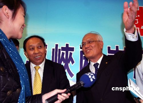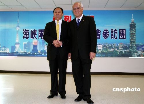 臺(tái)灣海峽兩岸航運(yùn)協(xié)會(huì)(“臺(tái)航會(huì)”)12月8日上午在臺(tái)北與來(lái)訪的海峽兩岸航運(yùn)交流協(xié)會(huì)(“海航會(huì)”)參訪團(tuán)座談。圖為海峽兩岸航運(yùn)交流協(xié)會(huì)理事長(zhǎng)胡漢湘和“臺(tái)航會(huì)”董事長(zhǎng)、長(zhǎng)榮海運(yùn)董事長(zhǎng)王龍雄在座談會(huì)中。胡漢湘說(shuō),兩岸航商爭(zhēng)先恐后要求參加首航,兩岸將同步行動(dòng),慶祝海運(yùn)首航。中新社發(fā) 劉舒凌 攝
