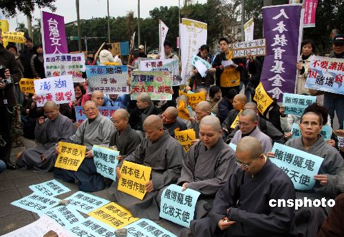 1月12日,臺灣“立法院”將表決離島建設條例部分條文修正草案,即博弈條款。圖為約百名反賭博合法化聯盟的成員,當天上午到“立法院”門口陳情抗議,表達反賭博合法化立場。中新社發 陳立宇 攝