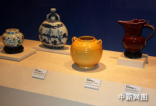 近日,為推廣臺北故宮“周末夜”活動,臺北故宮博物院在臺北火車站設置長箱型玻璃廣告廊,以高仿真度的館藏文物進行宣介。圖為展示的仿明代前期官營作坊的瓷器。 中新社記者 陳立宇 攝