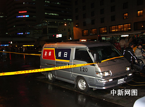 3月6日下午,臺北市南京東路三段國泰世華銀行復(fù)興分行前發(fā)生銀行搶劫案,一名歹徒在連開6槍,擊傷1名運(yùn)鈔車保全人員后,劫走兩袋共新臺幣278萬元的現(xiàn)鈔逃逸。傍晚時分,警方已在案發(fā)現(xiàn)場附近拉起封鎖線。圖為仍停在現(xiàn)場封鎖線內(nèi)的保全公司運(yùn)鈔車。中新社記者 陳立宇 攝