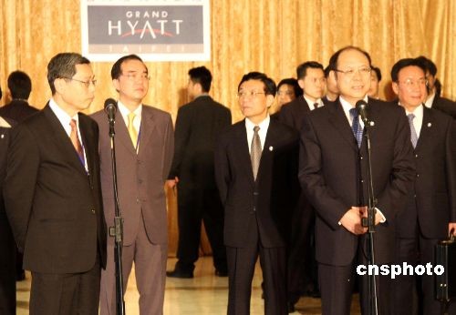 大陸海協(xié)會(huì)協(xié)商代表團(tuán)一行四月十七日下午抵達(dá)臺(tái)北。圖為代表團(tuán)入住君悅大飯店時(shí),臺(tái)灣海基會(huì)副董事長(zhǎng)高孔廉(左一)在大堂迎候。海協(xié)會(huì)常務(wù)副會(huì)長(zhǎng)鄭立中(右二)、副會(huì)長(zhǎng)李炳才(右三)、李亞飛(右一)與等候的媒體記者見(jiàn)面,鄭立中發(fā)表簡(jiǎn)短談話。中新社發(fā) 耿軍 攝