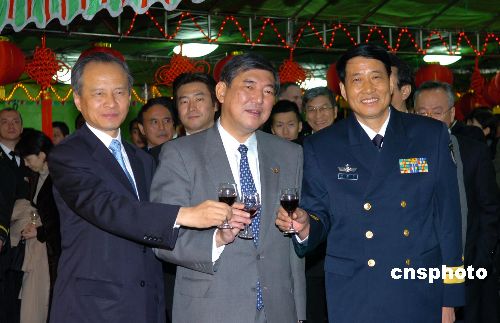 11月30日晚,正在日本進行正式友好訪問的中國海軍導彈驅逐艦“深圳號”在甲板舉行招待會,日本防務大臣石破茂、海軍司令吉川榮治,中國駐日大使崔天凱、公使孔鉉佑、武官徐京明等出席,日本107護衛艦官兵代表及各國駐日武官三百多人參加。圖為崔天凱大使(左)、石破茂防務大臣(中)和中國海軍軍艦訪日團指揮員、南海艦隊副司令肖海洋少將,共同舉杯祝愿中日兩國世代友好。中新社發 滕劍峰 攝