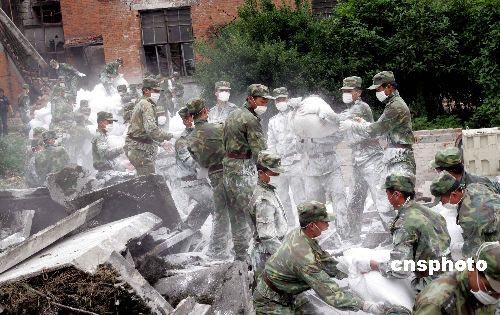 5月20日,濟南軍區某機步旅十二連官兵冒著中毒的危險,幫助四川省彭州市新科油化助劑有限公司緊急轉移增粘劑、阻燃劑等55噸有微毒的化學原料。官兵們在震塌的廢墟中仔細尋找、快速搶運,把散落的化工原料用袋子裝起來,為災區挽回了300多萬元的損失。圖為官兵們搶運時的情景。中新社發 施文標 攝