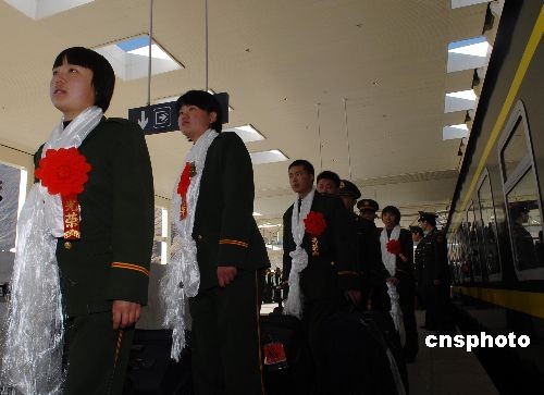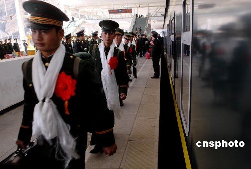 11月25日,駐藏某部及武警西藏森林總隊(duì)的退伍老兵們?cè)趹?zhàn)友和拉薩當(dāng)?shù)厝罕姷臍g送下踏上了回家的青鐵列車。從有關(guān)部門獲悉,拉薩火車站已經(jīng)為新老兵準(zhǔn)備了充足的車輛和票額。另?yè)?jù)了解,今年鐵路新老兵運(yùn)輸將繼續(xù)執(zhí)行購(gòu)票、行李托運(yùn)、進(jìn)出站和中轉(zhuǎn)換乘“四優(yōu)先”原則,為新老兵排憂解難、提供方便,確保新老兵乘車有票、上車有座,退伍老兵在旅客列車上用餐也將享受優(yōu)惠。 中新社發(fā) 龍昊 攝