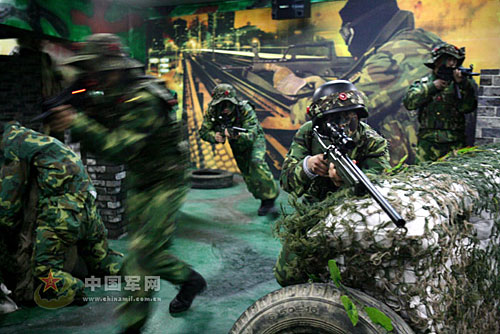 “Go,Go,Go!”12月2日下午, 一場激烈的“戰(zhàn)斗”對決在一塊特殊的陣地上進(jìn)行!皯(zhàn)場”上矮墻林立、沙包堆積、枯樹橫亙,周圍則“炮火”連天,上空“飛機(jī)”盤旋……。戰(zhàn)士們身著作戰(zhàn)服,手持仿真槍,頭戴裝有感應(yīng)器的頭盔,在時(shí)明時(shí)暗的“夜空”下穿梭,尋找目標(biāo),激烈對抗。這是某炮兵團(tuán)日前建成的真人CS對抗陣地上的精彩一幕。據(jù)前來觀摩的總部領(lǐng)導(dǎo)介紹,實(shí)施真人CS對抗練兵在我軍部隊(duì)還是首家。