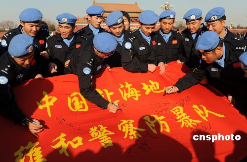 2009年1月1日,中國第八支赴海地維和警察防暴隊在北京八達嶺長城和天安門廣場舉行維和宣誓暨簽名活動,激勵全體隊員牢記維和職責,苦練精兵,為維護世界和平做出積極貢獻。該支維和警察防暴隊以山東公安邊防總隊為主組建,目前正在河北廊坊中國維和警察培訓中心接受綜合培訓,將于今年4月份出征海地執(zhí)行維和任務。中新社發(fā) 由永懷 攝