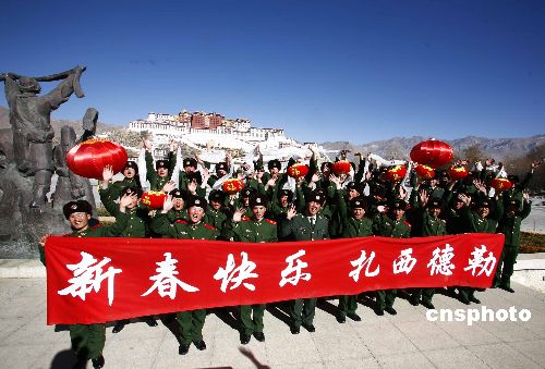 春節臨近,1月18日,武警西藏總隊拉薩市支隊一中隊官兵手捧哈達和紅燈籠,向全國人民祝賀新春快樂:扎西德勒。中新社發 趙艷志 攝
