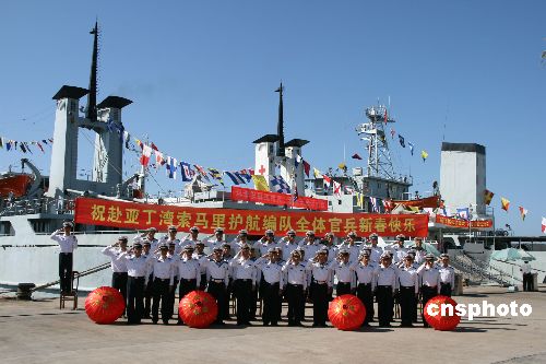 春節前夕(1月21日),遠赴亞丁灣執行護航任務的“微山湖”艦所在的南海艦隊某勤務船大隊官兵,打出橫幅,祝福全體護航官兵新春快樂,向他們拜早年,并向他們致以崇高的軍禮。中新社發 劉林 攝
