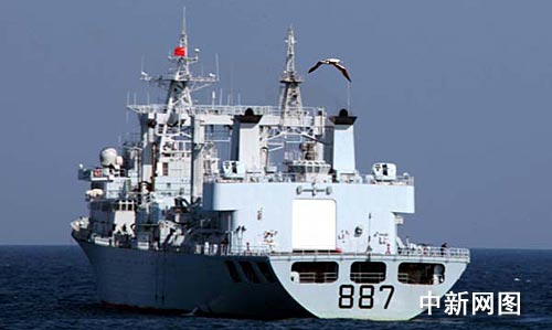 “海口”號導彈驅逐艦新春與“微山湖”號綜合補給艦在海上進行補給時,一只海鷗從“微山湖”艦上空飛過。中新社記者 孫自法 攝