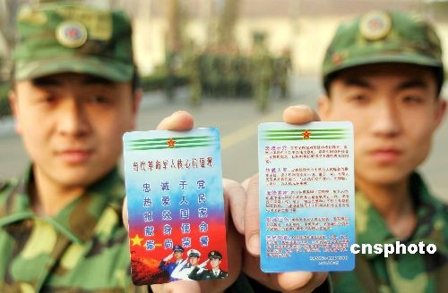 3月9日,部隊官兵正在展示革命軍人核心價值觀“銘記卡”。為加深官兵對當代革命軍人核心價值觀的理解掌握,濟南軍區某部為每名官兵制作了一張小巧精美的當代革命軍人核心價值觀“銘記卡”,正面是五個方面的基本內容,背面是簡要的基本內涵,官兵們可以隨時從衣兜里取出背記。中新社發 梁志杰 攝