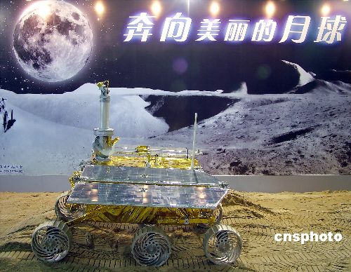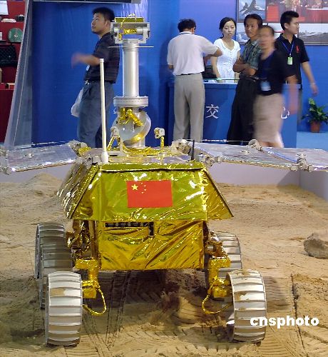 7月9日,腳踩6個(gè)輪子,站在“月球”表面,頭頂CCD相機(jī)四周轉(zhuǎn)動(dòng),巡視到的場(chǎng)景在電腦上即時(shí)傳送……在上海航空展中,“月球巡視探測(cè)器”表現(xiàn)不凡。據(jù)了解,經(jīng)過層層審批才得以在公眾前亮相的月球車,將于2012年“嫦娥工程”實(shí)現(xiàn)“落地”計(jì)劃后登陸月球。中新社發(fā) 紹常 攝