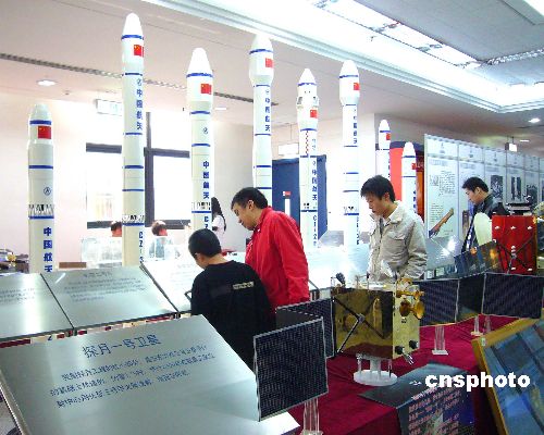 10月29日,在北京西單圖書大廈,中國航空航天知識普及展上的實物模型及與之相關的科普書籍讓觀者大飽了眼福。隨著“嫦娥一號”的發射成功,京城掀起了一股普及和了解祖國航空航天發展成就的熱潮。中新社發 玉龍 攝
