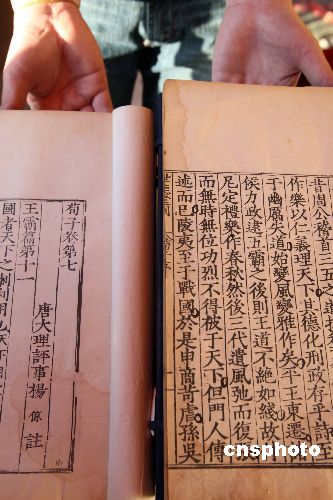 北京地壇秋季書市十一月上旬正在火爆進(jìn)行中,今年亮點(diǎn)之一的舊書淘寶一條街,成為許多酷愛(ài)古舊圖書的“書蟲”光顧最多的去處。圖為價(jià)值十余萬(wàn)的明嘉靖世德堂刻印——《荀子二十卷》亮相北京秋季書市。中新社發(fā) 任海霞 攝