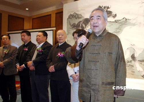 2007年11月11日,“范曾先生精選作品展”在濟南市銀座美術(shù)館舉行。本次展覽共展出范曾先生不同時期人物畫精品60余幅,其中《八仙圖》、《蘇子侶鶴圖》等巨幅畫作尤其引人注目。當天,范曾先生及其夫人、兒子出席了開幕式,千余名書畫愛好者和市民到場參觀。中新社發(fā) 龔輝 攝