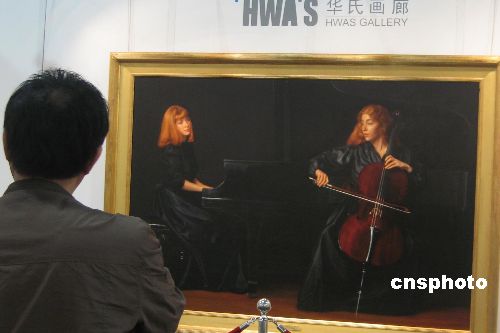 全亞洲最大規模的藝術品展示交易平臺——二○○七(第十一屆)上海藝術博覽會十一月十五日起在上海世貿商城舉行,眾多海內外實力畫廊或機構均攜其得意之作前來參展。圖為由上海華氏畫廊參展的已故大師陳逸飛油畫代表作《二重奏》,這是陳逸飛音樂題材肖像畫中尺寸最大的一幅,也是他當年轟動美國藝術界的重量級油畫作品。中新社發 孫璐 攝