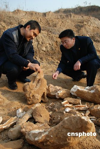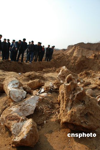 12月5日,山東淄博周村區王村鎮西道村磚廠挖掘出疑似“恐龍”的巨型動物骨骼化石。當日10點48分,正在淄博周村區王村鎮西道村磚廠施工的司機小郝,給村主任劉道新打電話說“挖掘機在工作時挖到了大量的化石,很像是動物的骨骼!痹诂F場進行保護的彭陽派出所的所長于成杰介紹說,這次挖到的化石很大,露出來的化石有6米多長,呈圓柱狀細端的直徑有18-19厘米,粗端的直徑有30-40厘米。其動物骨格的特征非常明顯,其體積顯然比大象要大的多,與史前動物“恐龍”骨骼化石極其相似。中新社發 梁寶海 攝