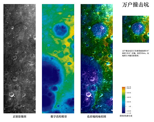 中國國家航天局今天向媒體發(fā)布信息說,“嫦娥一號”衛(wèi)星CCD相機(jī)已對月球背面進(jìn)行成像探測,并獲取了月球背面部分區(qū)域的影像圖。此圖顯示的是萬戶撞擊坑。萬戶撞擊坑位于月球背面南緯9.8度西經(jīng)138.8度區(qū)域,直徑52km,從地球上不能直接看到。