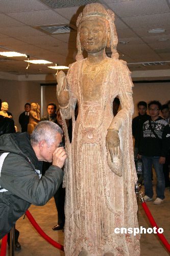 一月四日,一位觀眾在臺灣中華皇家藝術博物館近距離欣賞首次展出的該館鎮(zhèn)館之寶——國寶級文物“大勢至菩薩”石像。由該館推出的“中華瑰寶系列——宋朝漢白玉十八羅漢特展”當日在臺北開展,造型中西合壁、保存完好,被認為是全球唯一保存最完整的“大勢至菩薩”塑像也同期與觀眾首度見面。據(jù)考證,這尊高一百九十八厘米、石灰石貼金敷彩“大勢至菩薩”為東魏至北齊年間作品,距今約一千六百年至一千四百年。中新社發(fā) 孫自法 攝