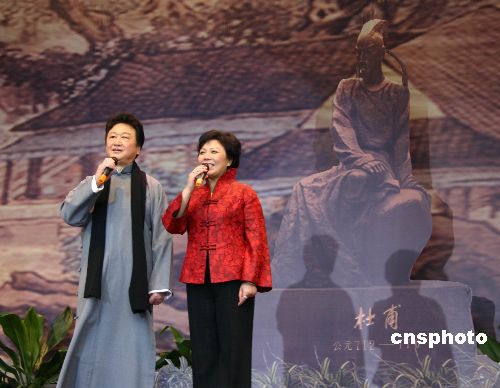 2月13日,中國農(nóng)歷戌子年正月初七“人日”,在“詩圣”故居成都杜甫草堂詩圣文化園,數(shù)千名成都市民和各地游人聚精會神觀賞“人日游草堂”大型文藝演出,感受濃厚的詩情畫意。圖為著名配音表演藝術(shù)家喬榛、丁建華現(xiàn)場表演詩歌朗誦。中新社發(fā) 霍潺 攝