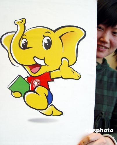 三月十二日,第十八屆全國圖書交易博覽會吉祥物、張貼畫、主題語在鄭州揭曉,圖為禮儀人員展示吉祥物“小象博克”,取義英文“book”。中新社發(fā) 李志全 攝