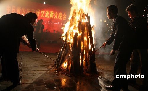 3月12日晚,正在重慶永川交流訪問的日本高中生訪華代表團與永川中學高中生攜手舉辦一場篝火晚會,中日兩國高中生圍繞著篝火一起踏歌起舞。中新社發 孫自法 攝
