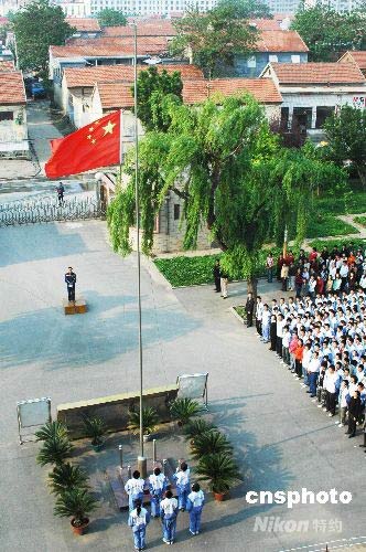 5月19日,山東鄒平縣實驗中學降半旗為四川地震中的遇難者致哀。國務院公告從19日到21日為全國哀悼日,各地降半旗致哀。中新社發 董乃德 攝