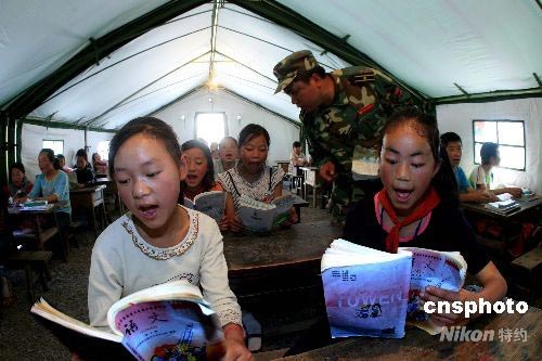 成都軍區駐渝某集團軍官兵步行100余公里進入茂縣后,進村入戶組得知受5月12日地震的破壞,四川省茂縣宗渠村小的教學樓、住宿樓倒塌。學校的302名學生被迫停課。他們立即組織官兵搭制帳篷小學,逐家逐戶走訪并告訴家長讓學生到帳篷小學上課,5月24日上午10時,在帳篷小學校長、駐渝某團代副團長嚴奎的宣布下,茂縣首座帳篷小學開課。中新社發 高效文 攝
