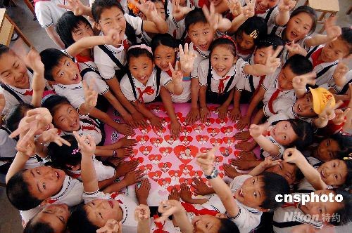 2008年5月30日,來自四川綿陽地震災(zāi)區(qū)、在日照市經(jīng)濟開發(fā)區(qū)第二小學(xué)上學(xué)的3名學(xué)生,在新學(xué)校與老師同學(xué)們歡慶“六一”兒童節(jié)。日照經(jīng)濟開發(fā)區(qū)第二小學(xué)的師生為3名同學(xué)送上精美禮物,祝福他們和四川地震災(zāi)區(qū)的小朋友節(jié)日快樂。近日,山東日照市教育部門安排3名投奔親友的四川地震災(zāi)區(qū)小學(xué)生就近在日照經(jīng)濟開發(fā)區(qū)二小上學(xué),學(xué)校為這3名學(xué)生捐贈了學(xué)習(xí)用品,并減免費用。中新社發(fā) 陳為峰 攝