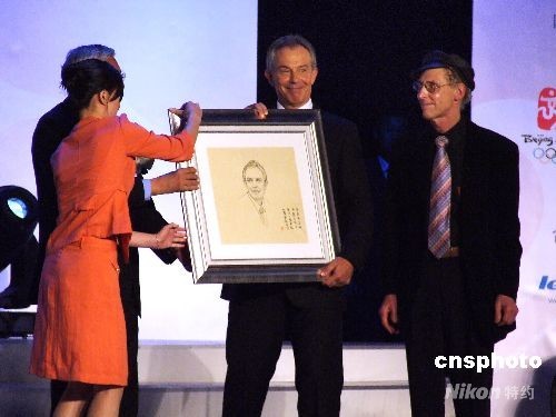 8月4日,由北京大學主辦的“2008奧運.冠軍論壇”在北京大學百年紀念講堂內隆重開幕。出席開幕盛典的貴賓有英國前首相托尼.布萊爾、成龍、譚盾、揚揚、羅雪娟在內的數十位中外嘉賓。圖為北京大學校長許智宏向英國前首相托尼.布萊爾贈送畫像。中新社發 鄭雄增 攝