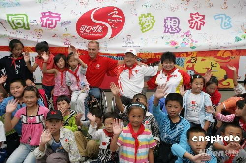 9月13日下午,北京50名希望小學的學生第一次走進殘奧會賽場,走近運動員,感受永不放棄的殘奧精神。隨后,同學們來到奧林匹克公園與北京2008年奧運會火炬手董志江、本屆殘奧會運動員董飛霞、前輪椅網球世界冠軍凱·施拉梅爾相互激勵、暢談理想。圖為董志江(后排左六)、董飛霞(后排左七)和凱-施拉梅爾(后排左五)與孩子們親切合影。中新社發 趙雋 攝